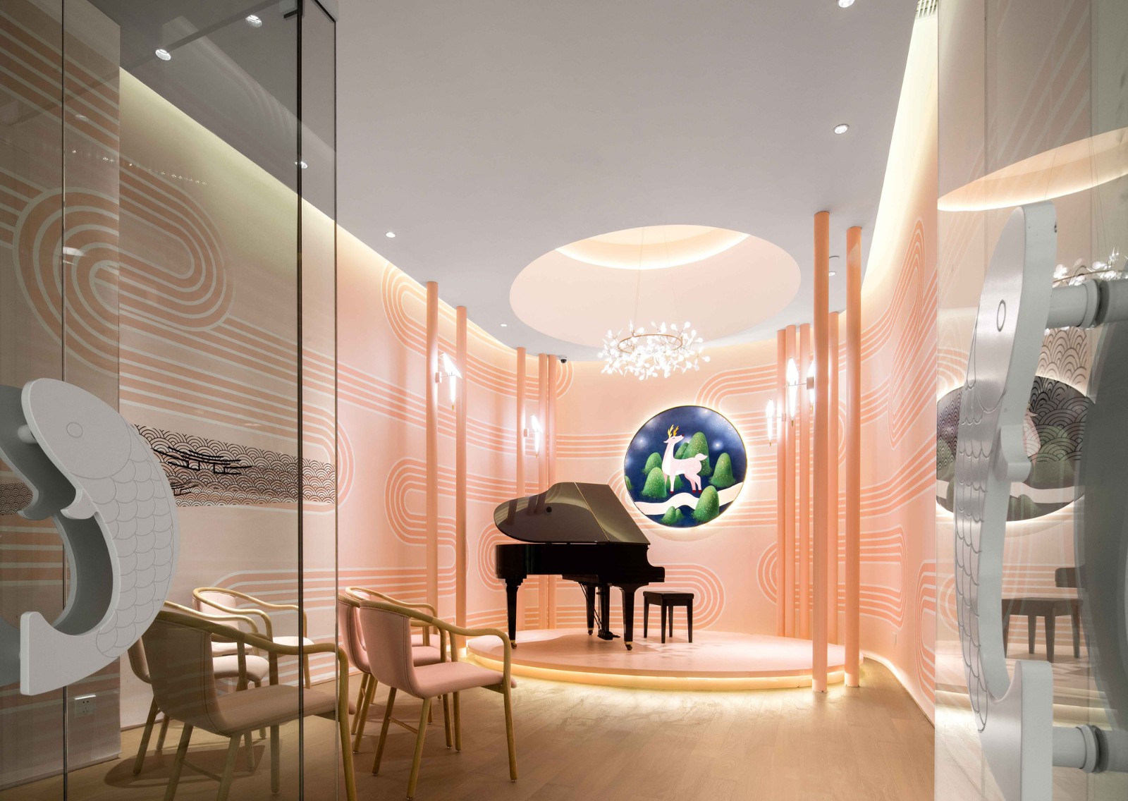 钢琴室以淡粉为主色调,设计师在这个空间中刻意“留白”,顶部的蒲公英吊灯为空间增添一丝丝梦幻气息,音符跃动,于指尖点滴起舞,自由,生动,喜悦,洁净,由此引导学习钢琴的孩童建立起对优雅事物的信仰。