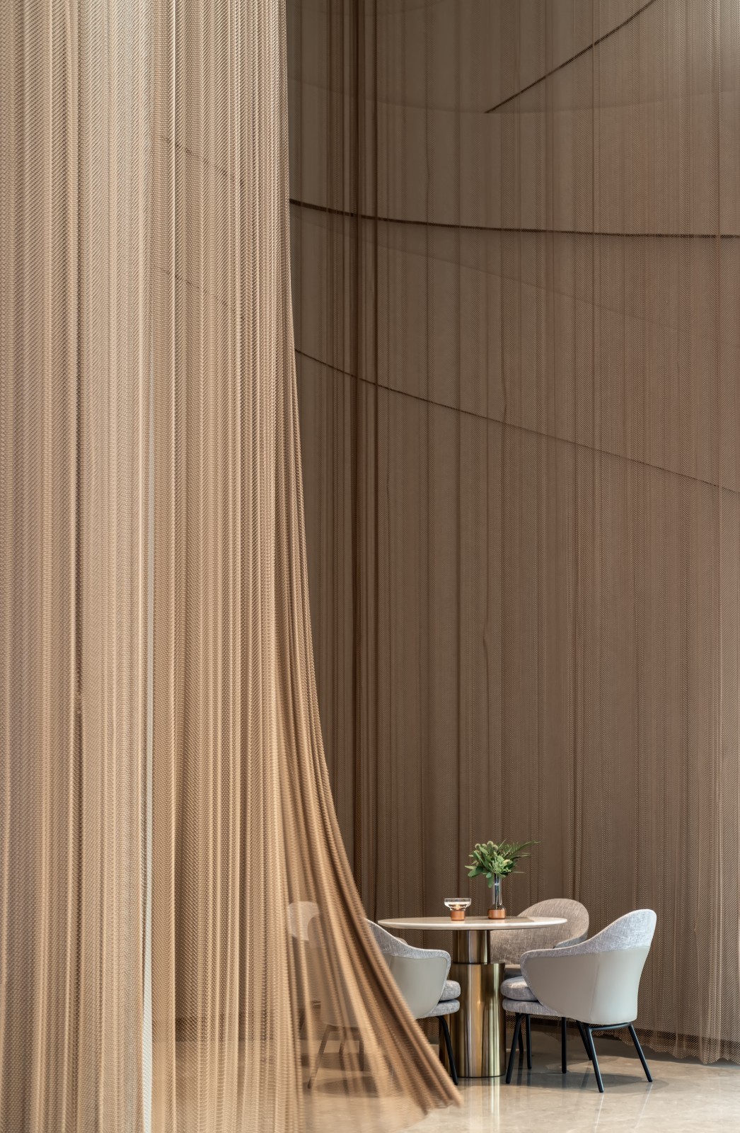 室内设计呼应并加强了建筑所要呈现的“未来感”,通过玻璃,可见室内空间的墙体结构隐约错落。设计大胆选用弹力极佳的纺织材料作为建筑延伸,在保证通透效果的同时,完成建筑幕墙的装饰效果,写意山与城关系中特有的层次性、秩序感、迂回美,恰到好处地衔接了室内空间与建筑外壳的关系,实现流畅的艺术融合和美学过渡。