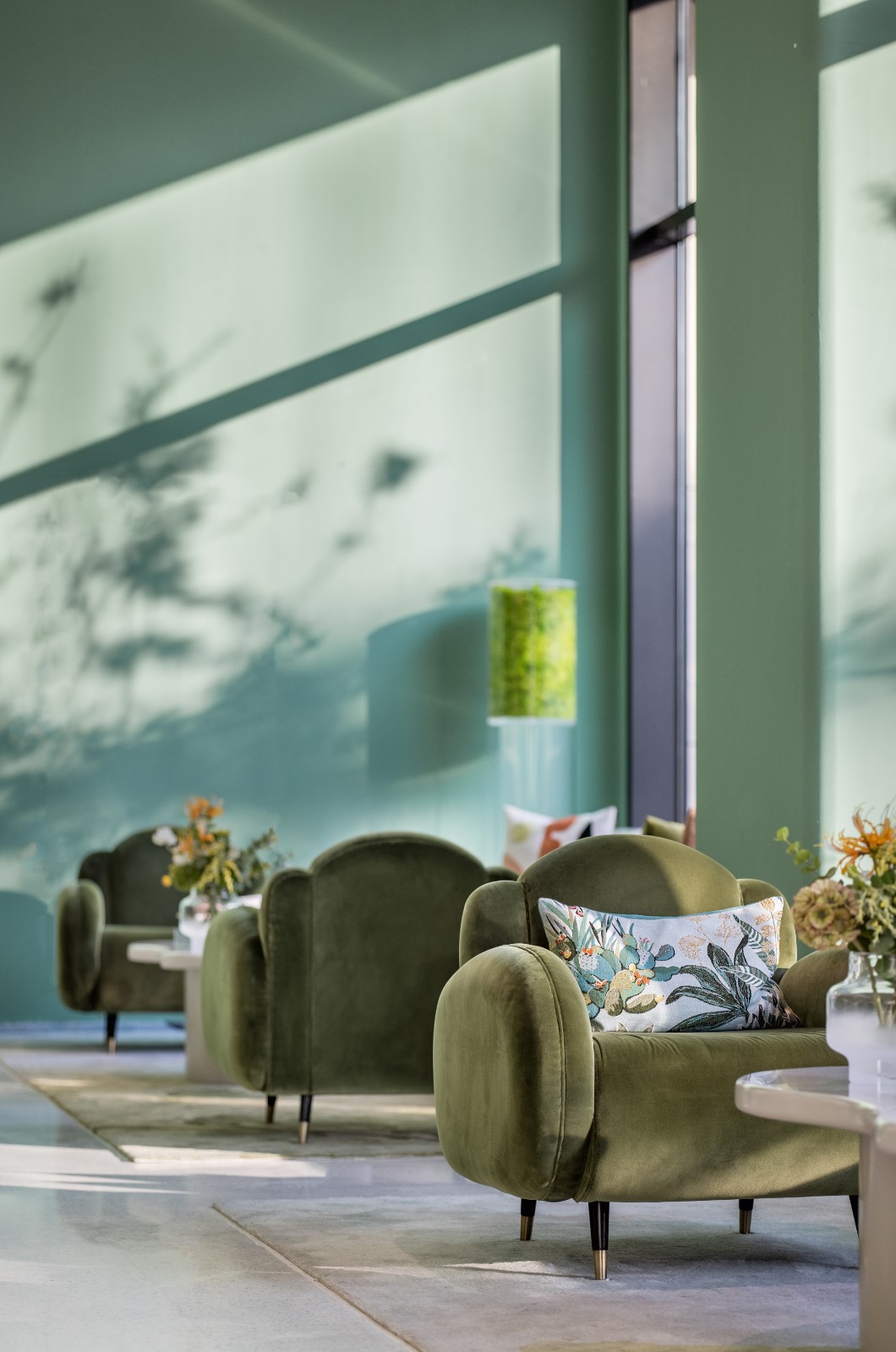 前台以大面积艺术漆打造简约现代基调,空间延续当地山水特色以趣味手法勾勒绿意生态,将大鹏自然生态优势延伸于室内,为观者打造生机盎然的初印象。