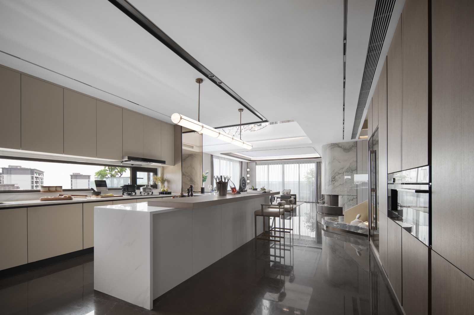 开放式餐厨满足内外社交需求,结合岩板、皮料与金属的碰撞使空间呈现品质质感,让餐厨间生活仪式感于此升华。餐厅区域与挑高二层形成连接,在空间中形成巧妙的互动,设计打破空间界限,让爱与温情在空间中蔓延,晚餐之间的欢声笑语充斥着整个空间。